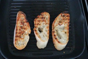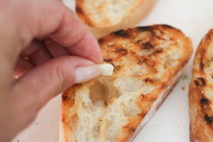 1. Rooster de sneetjes brood licht krokant in een grillpan of broodrooster. Wrijf ze in met een teentje knoflook.