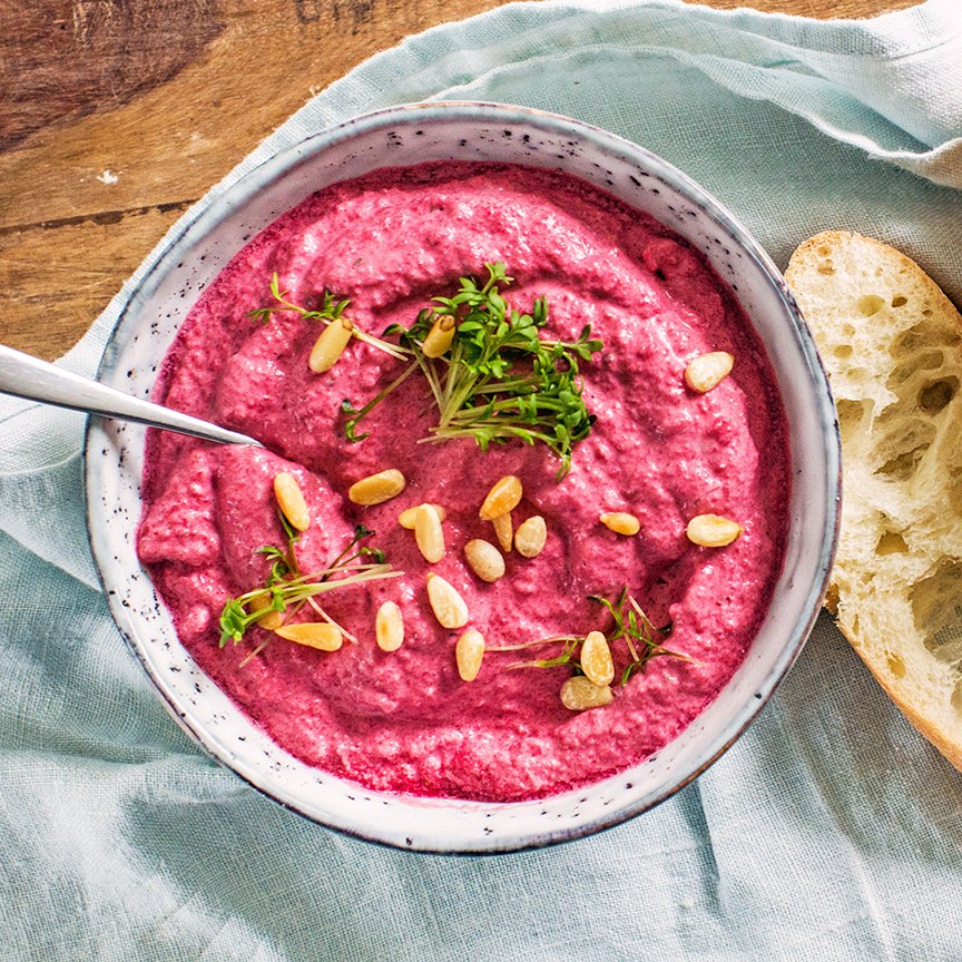 2. Verdeel de bieten spread in een kom en garneer met pijnboompitten en tuinkers. Serveer de spread met het ciabatta brood.