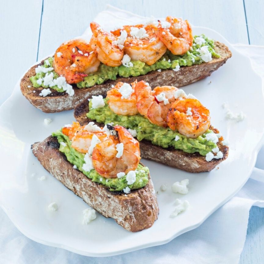 7. Wrijf de bruschetta’s in met een teentje knoflook en besmeer met de avocado puree.