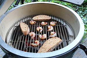 6. Leg de garnalen er voorzichtig op en bak ze in ca. 5 minuten gaar. Leg halverwege ook de broodjes erbij en rooster deze licht krokant.