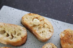 1. Snijd het brood in plakken en besmeer met olijfolie. Grill de broodjes aan beide kanten in een (grill)pan licht krokant. Wrijf daarna in met de teen knoflook.