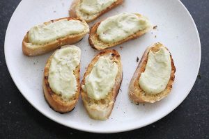 4. Besmeer de bruschetta’s met de romige pesto. Beleg met de gegrilde groene asperges.