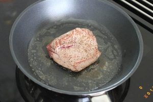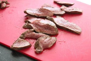 2. Bak ondertussen de biefstuk in een pan met een beetje olie of boter. Bestrooi met peper en zout. Schroei hem eerst dicht op hoog vuur en zet daarna het vuur lager en bak nog 3 minuten voor rare, 5 minuten voor medium of 8 minuten voor doorbakken. Afhankelijk van de dikte van het vlees. Leg hem daarna 5 minuutjes in een stuk aluminiumfolie om te rusten.