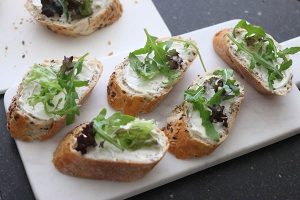 3. Besmeer de bruschetta’s met roomkaas en verdeel wat rucola er over.