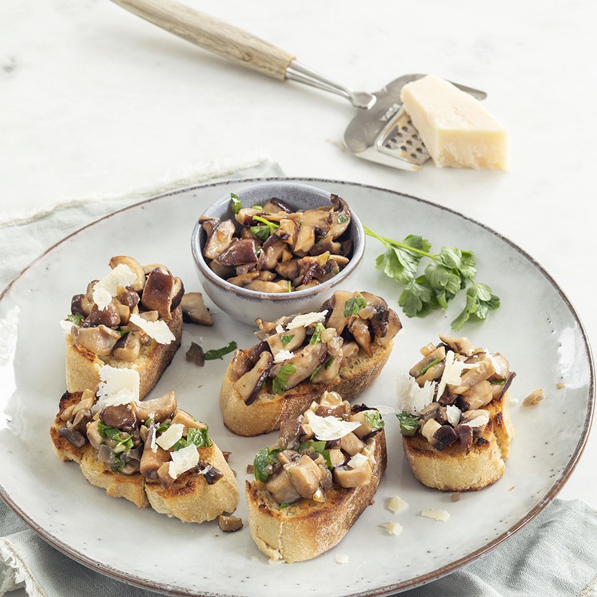 3. Verdeel het paddenstoelenmengsel over de bruschetta’s. Rasp de Parmezaanse kaas erover en bestrooi met wat extra peterselie. Serveer lauwwarm of koud.