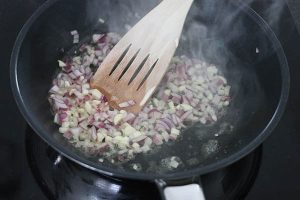 2. Hak het andere teentje knoflook fijn samen met het uitje. Fruit dit aan in de pan. Hak de paddenstoelen grof. Bak deze ook mee in de pan. Breng op smaak met een snufje peper en zout en voeg wat fijngehakte peterselie toe. Blus af met de balsamico azijn en laat iets inkoken.