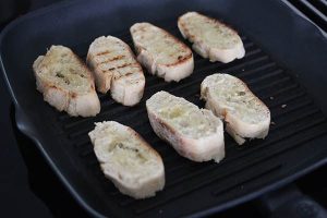 1. Snijd het brood in sneetjes. Bestrijk ze aan beide kanten met een dun laagje olijfolie. Verhit een grillpan en grill de broodjes hier in licht krokant. Wrijf de bruschetta’s aan 1 zijde in met 1 teentje knoflook.