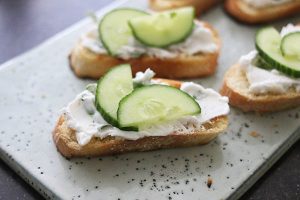 7. Besmeer de bruschetta’s met het roommengsel, beleg met wat plakjes komkommer en verdeel wat zalm erover.