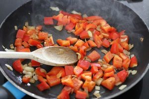 1. Kook de rijst gaar. Snipper de ui fijn en hak de paprika in stukjes. Bak deze 5 minuutjes in een koekenpan met een beetje olie. Voeg de kip er aan toe en bak tot deze gaar is.