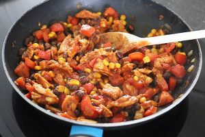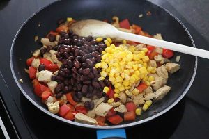 2. Voeg de kruiden toe en vervolgens ook de tomatensaus. Roer door elkaar. Voeg de uitgelekte bonen en mais toe. Laat het burrito mengsel een paar minuutjes doorwarmen.