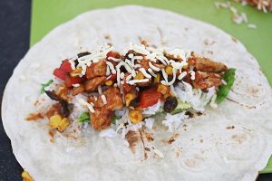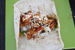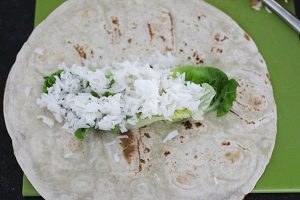 3. Verwarm een tortilla. Leg 2 blaadjes sla in het midden. Schep hier een beetje rijst op en het kipmengsel. Bestrooi met een beetje kaas. Vouw de 2 korte zijkanten iets over het mengsel en rol de tortilla met vulling op. Wikkel de burrito aluminiumfolie of ā€˜plak’ de rand vast met een beetje zure room zodat hij niet open gaat.