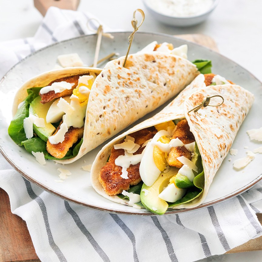 4. Leg op een wrap wat sla, stukken kip, plakjes avocado en ei. Schep een beetje dressing erop en bestrooi met Parmezaanse kaas. Vouw de wraps dicht en steek vast met een prikkertje.