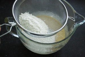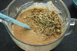 2. Zeef het zelfrijzend bakmeel erbij en voeg en zout en kaneel toe en schep met een houten lepel er door. Schep de geraspte wortels door het beslag. Hak de walnoten grofen schep ook door het beslag.