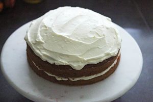 4. Mix de roomkaas en boter samen met het poedersuiker door elkaar tot een egale en romige frosting. Snijd de carrotcake als hij helemaal is afgekoeld horizontaal doormidden. Verdeel ongeveer de helft van de roomkaas frosting over de onderzijde en leg de bovenzijde er weer op. Besmeer nu de bovenzijde met de rest van de roomkaas frosting. Garneer de bovenzijde met een aantal halve walnoten.