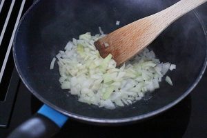1. Snipper de ui en bak deze in een grote (wok)pan met een beetje olie of margarine.