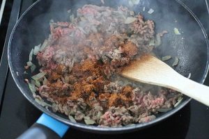 2. Voeg het gehakt toe en bak dit rul. Voeg 2 eetlepels van de chili con carne kruidenmix toe.