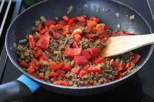 3. Snijd de rode paprika’s in stukjes en bak een paar minuten mee.