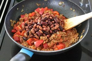 6. Doe dan de bonen en maïs bij de tomatensaus met gehakt en laat nog 10 minuten pruttelen.