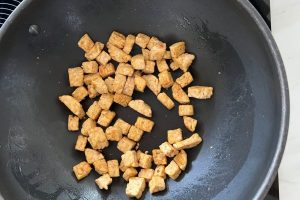 2. Verhit 1 eetlepel sesamolie in een grote (wok)pan op middelhoog vuur. Voeg de tempéblokjes toe en bak ze goudbruin aan alle kanten. Haal de tempé uit de pan, doe het in een bakje en zet opzij.