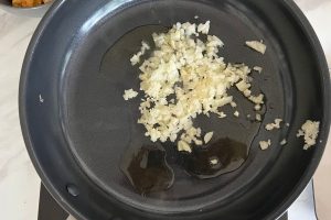 3. Voeg nog 1 eetlepel sesamolie toe aan de wokpan. Voeg de fijngehakte ui en knoflook toe en fruit tot ze zacht en geurig zijn.