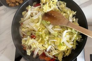 6. Voeg de reepjes Chinese kool toe en bak mee tot ze beginnen te slinken.