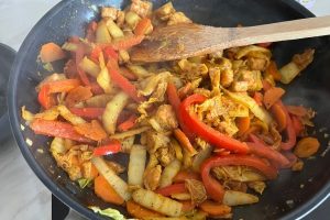 4. Voeg de rode paprika en wortel toe en roerbak gedurende enkele minuten tot ze iets zachter zijn.