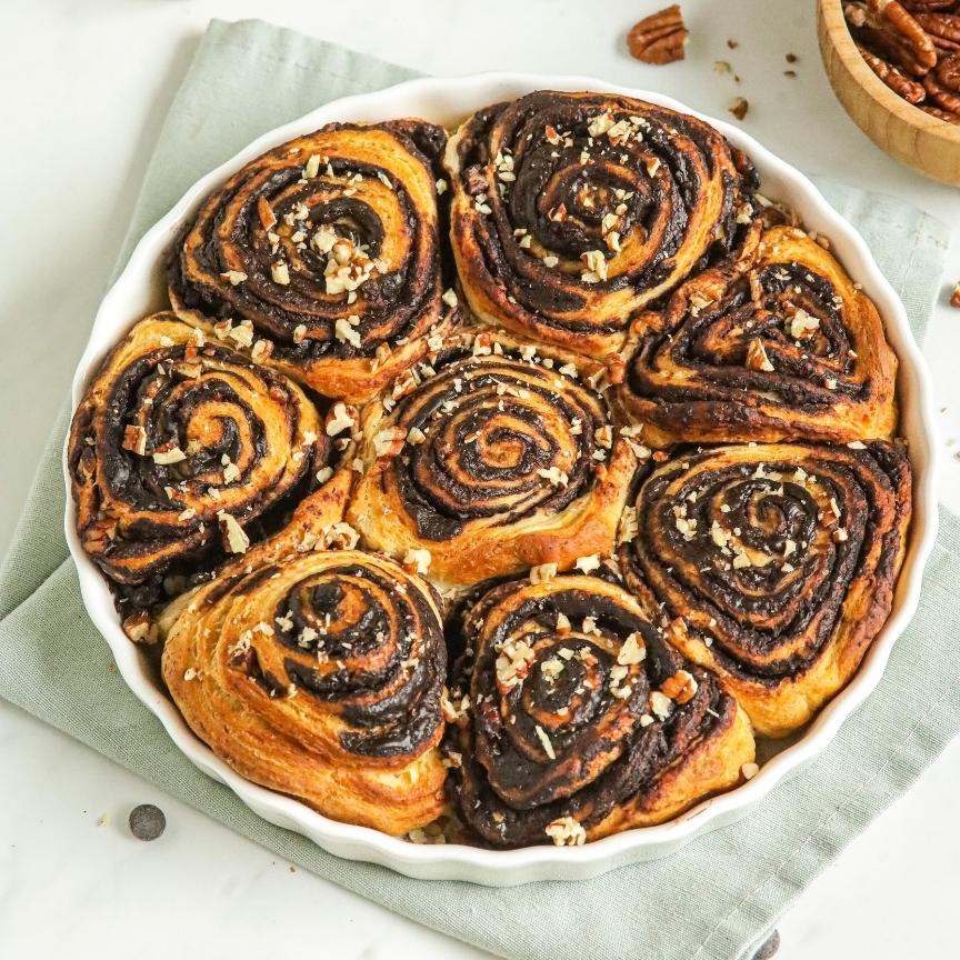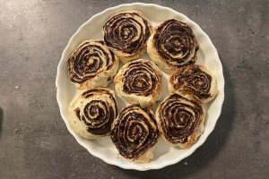 7. Leg de rolletjes in de ronde ovenschaal en zet deze in de oven. Bak de chocolade rolletjes in 15 minuten in de voorverwarmde oven.