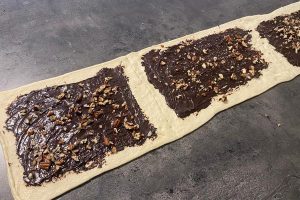 5. Besmeer het deeg met de vegan chocoladepasta en verdeel met de fijngehakte pecannoten er overheen.