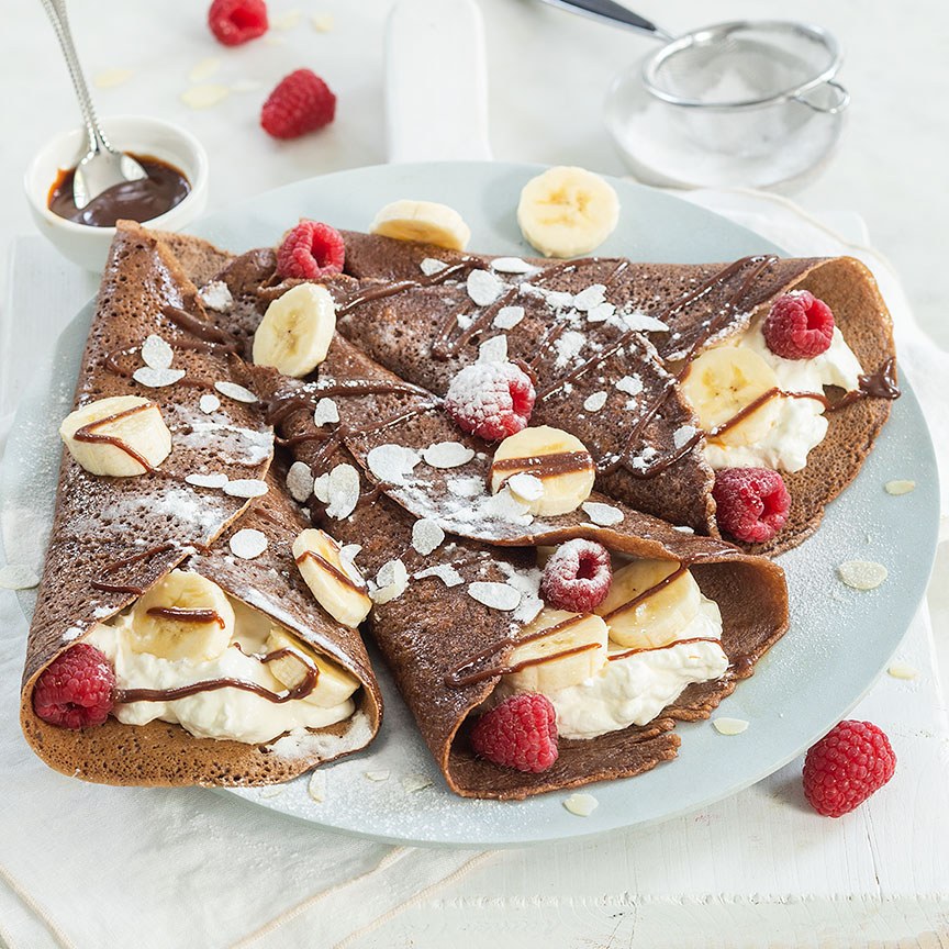 4. Laat de pannenkoeken (iets) afkoelen en schep er wat slagroom op. Leg er wat schijfjes banaan en frambozen op en bestrooi met nootjes. Drizzel er nog wat chocoladesaus over.
