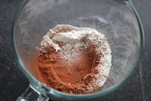 1. Doe de bloem, bakpoeder en cacao in een kom en voeg een snufje zout hieraan toe. Maak een kuiltje in het midden en kluts de eieren erin.