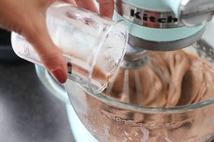 2. Voeg ongeveer ¼ van de chocolademelk erbij en mix dan tot een gladde massa. Voeg dan beetje bij beetje de rest van de chocolademelk toe en mix tot een egaal beslag.