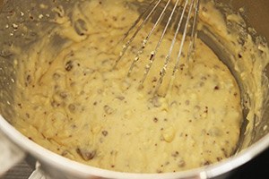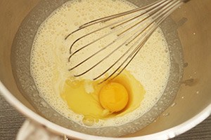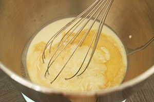 1. Verwarm de oven op 190 graden. Doe de slagroom in een kom en voeg de suiker en vanille aroma toe. Klop met een garde (of kort met de mixer) doorelkaar. Kluts de eieren erbij en mix er ook door.