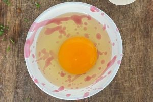 3. Breng water in een steelpan aan de kook met een scheutje azijn. Als het kook zet je het vuur laag zodat het water niet meer borrelt. Breek het ei in een klein kommetje, draai ondertussen met een lepel een draaikolkje in het water en laat het ei daar voorzichtig in glijden.