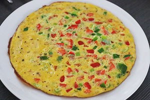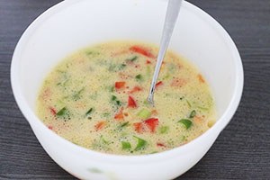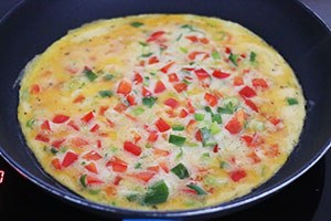 1. Klop de eieren los en meng met een scheutje melk en wat peper en zout. Snijd de bosui en paprika in kleine stukken en voeg toe aan het eiermengsel. Schud het geheel in een grote koekenpan en bak de omelet gaar. Snijd de omelet in vier stukken.