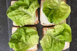 3. Neem 4 sneetjes brood en besmeer deze met de mayonaise (of aioli). Beleg met: blaadje sla, kipfilet, tomaat, kaas, gebakken spek en dek weer af met sla.