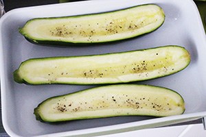 1. Verwarm de oven op 200 graden. Halveer de courgette in de lengte en schraap wat van het vruchtvlees er uit. Bestrooi de binnenzijde met wat peper en zout. Leg de courgettes in een ovenschaal of op een bakplaat en zet 25 minuten in de oven.