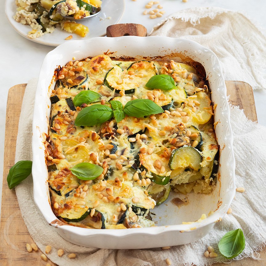 6. Doe het aardappel-courgette mengsel in een ingevette ovenschaal. Giet het ricottamengsel over de ovenschotel en bestrooi met kaas en pijnboompitten.