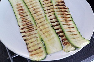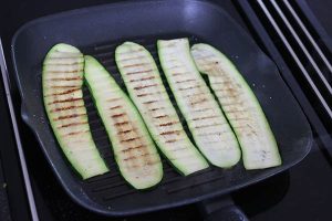 3. Grill de courgetterepen tot ze mooie grillstrepen hebben. Leg ze even weg op een keukenpapiertje om af te koelen en uit te lekken.