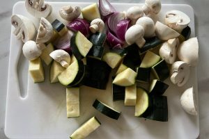 1. Snijd de courgette en rode uien in stukken en de champignons door de helft of in kwarten (afhankelijk van de grootte) en leg ze opzij.
