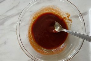 2. Maak de saus door de tomatenpuree met de sojasaus, kruiden, olijfolie en water te mixen. Breng op smaak met peper en zout.
