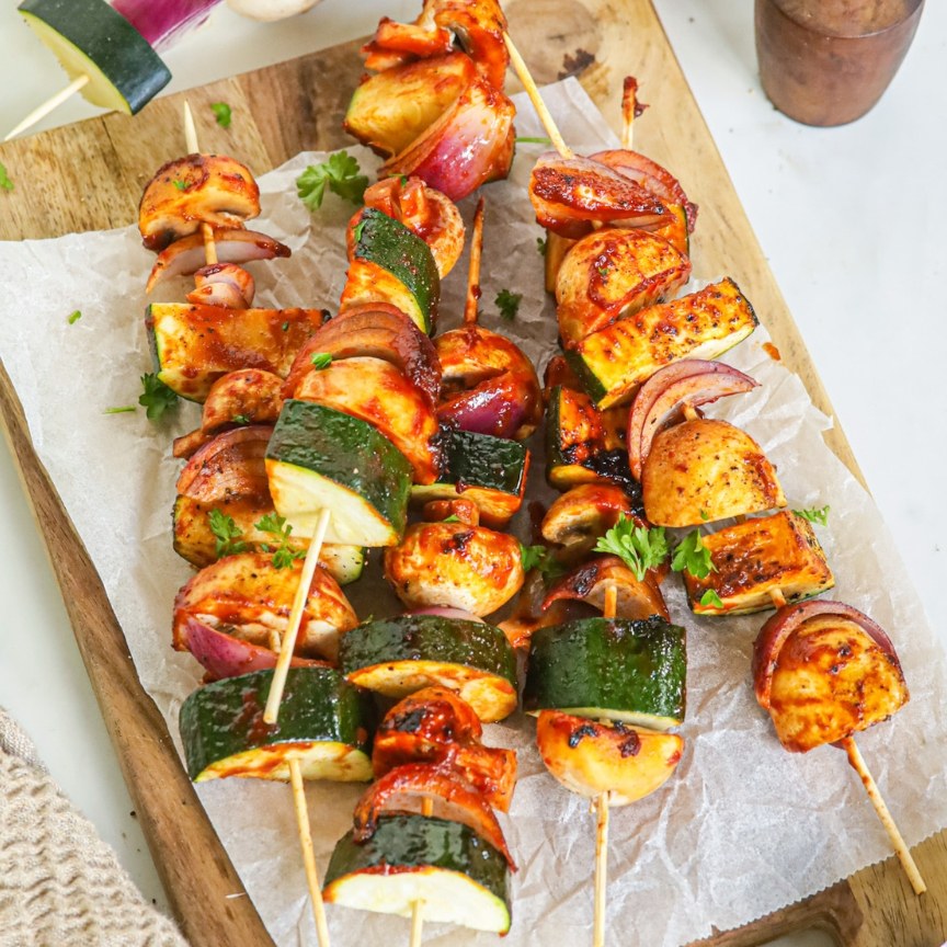 3. Rijg de groenten aan de spiesen. Leg ze op een bord en smeer met een kwartje de saus over de groenten.