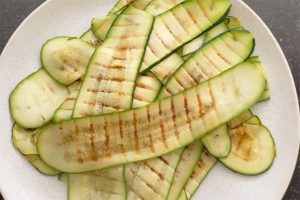 2. Bestrijk de courgette linten met een beetje olie. Verhit een grillpan en grill de courgettes kort in de pan tot er mooie grillstrepen te zien zijn.