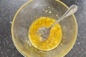 4. Meng een scheutje olijfolie met de rasp en het sap van de citroen. Pers het teentje knoflook erbij en breng op smaak met een snufje peper en zout. Meng goed door elkaar.