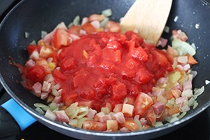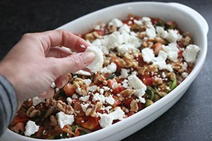 1. Verwarm de oven op 180 graden. Fruit de ui en knoflook aan in een pan samen met de spekblokjes. Voeg de tomatenblokjes toe. Breng op smaak met peper, zout, snuf paprikapoeder en Italiaanse kruiden. Maak slierten van de courgettes. Bak deze in een pan een paar minuten tot ze beginnen te slinken. Laat ze goed uitlekken in een vergiet of zeef en schep daarna door de tomatensaus. Doe het mengsel vervolgens in een ovenschaal en kruimel de feta en noten er over. Zet de schaal 10 minuten in de oven. Ook lekker om met een stuk brood in te dippen.