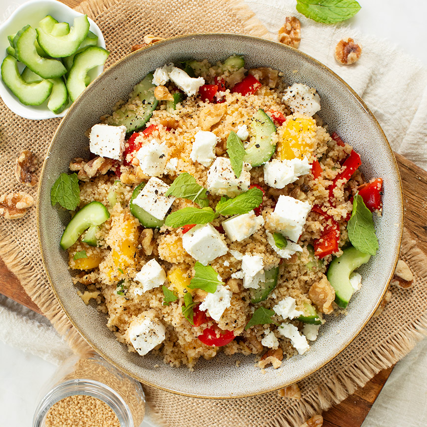 5. Schep nu de gesneden groenten, mango, munt en walnoten door de couscous en meng alles goed door elkaar. Voeg als laatste de blokjes feta toe en roer voorzichtig om te voorkomen dat ze te veel verkruimelen.