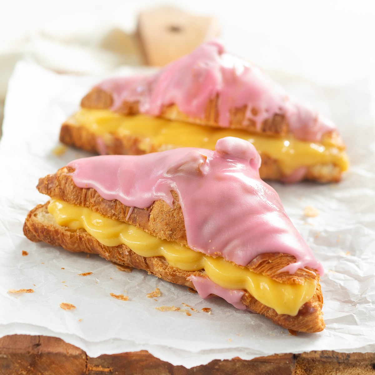 4. Neem de gele room en doe in een spuitzak. Leg de croissants open en spuit er royaal gele room op. Serveer direct of bewaar maximaal 1 dag in de koelkast.