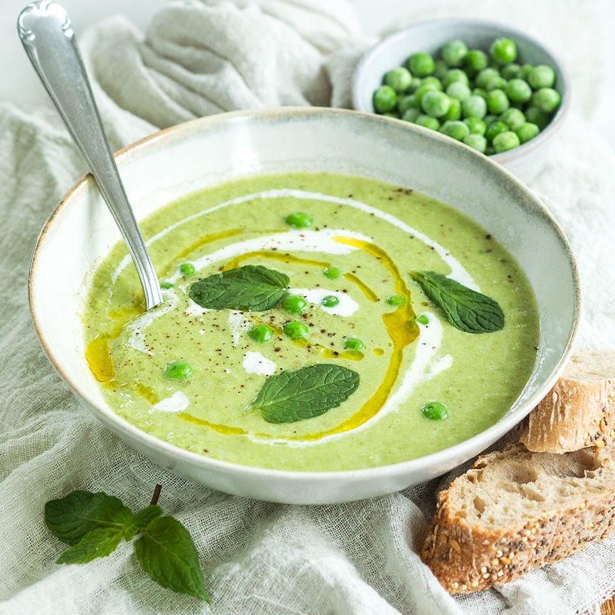 7. Garneer de soep met wat munt, extra erwtjes en maak een swirl met room of olie.