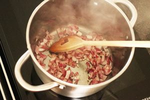 1. Snipper het uitje en de knoflook en fruit deze aan in een soeppan.
