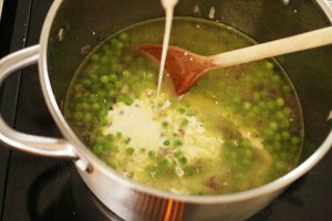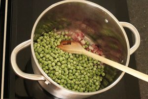 5. Kook de erwtjes ca. 10 minuutjes en pureer dan fijn met een staafmixer. Je kunt dit ook in een (sterke) blender doen.