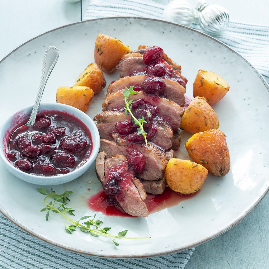 3. Snijd het vet van de eendenborst in ruitjes met een scherp mes. Let op dat je niet in het vlees snijdt, alleen in het vet. Verhit boter in een koekenpan en bak de eend op de vetkant ongeveer 6 minuten op middelhoog vuur. Bak de eend nog 5 minuten aan de andere kant tot de eend mooi rosé is. Bestrooi met peper en zout. Laat ze een paar minuten rusten in een stuk aluminiumfolie. Snijd de gebakken eendenborsten in plakjes en serveer met de cranberry compote en geroosterde aardappels.